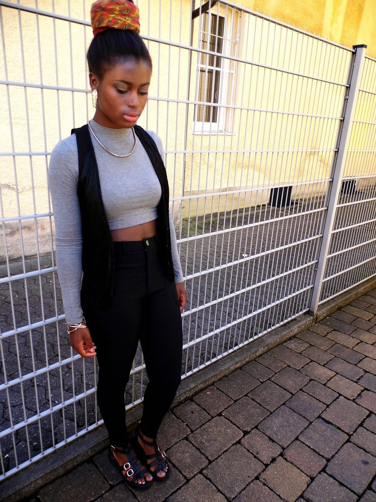 With this look I’m keeping it quite african style thingy – ok very weird description but that’s how I’m gonna call it till I come up with something better. So styled a grey croptop, threw a fringe vest on and wrapped a scarf around my dutt. I saw that on a gorgeous girl on instagram couple months ago and tried it out and since then done it quite frequently actually ( well I do bun my hair 99% of the time ) and been loving it. I just think it gives a nice edgy touch to it.