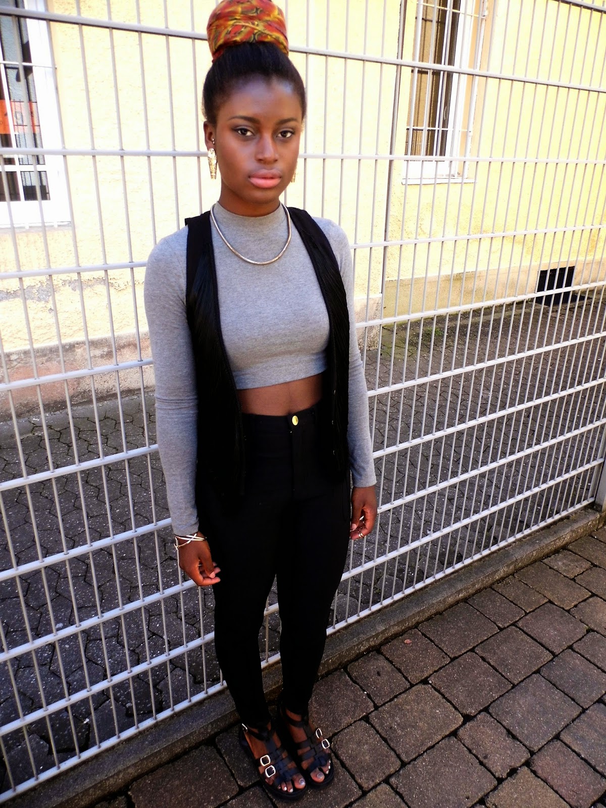DE: Hallöchen meine Lieben! Heute seht ihr meinen african style thingy Look – ja sehr professioneller Beschreibung für meinen Look nicht wahr?! Aber anders kann ich es irgendwie nicht in Worte fassen. Nun ja, habe einfach ein graues Crop top zu einer Fransenweste gestylt und ein lässiges Tuch um meinen Dutt gewickelt – damit geboren der african thingy look.